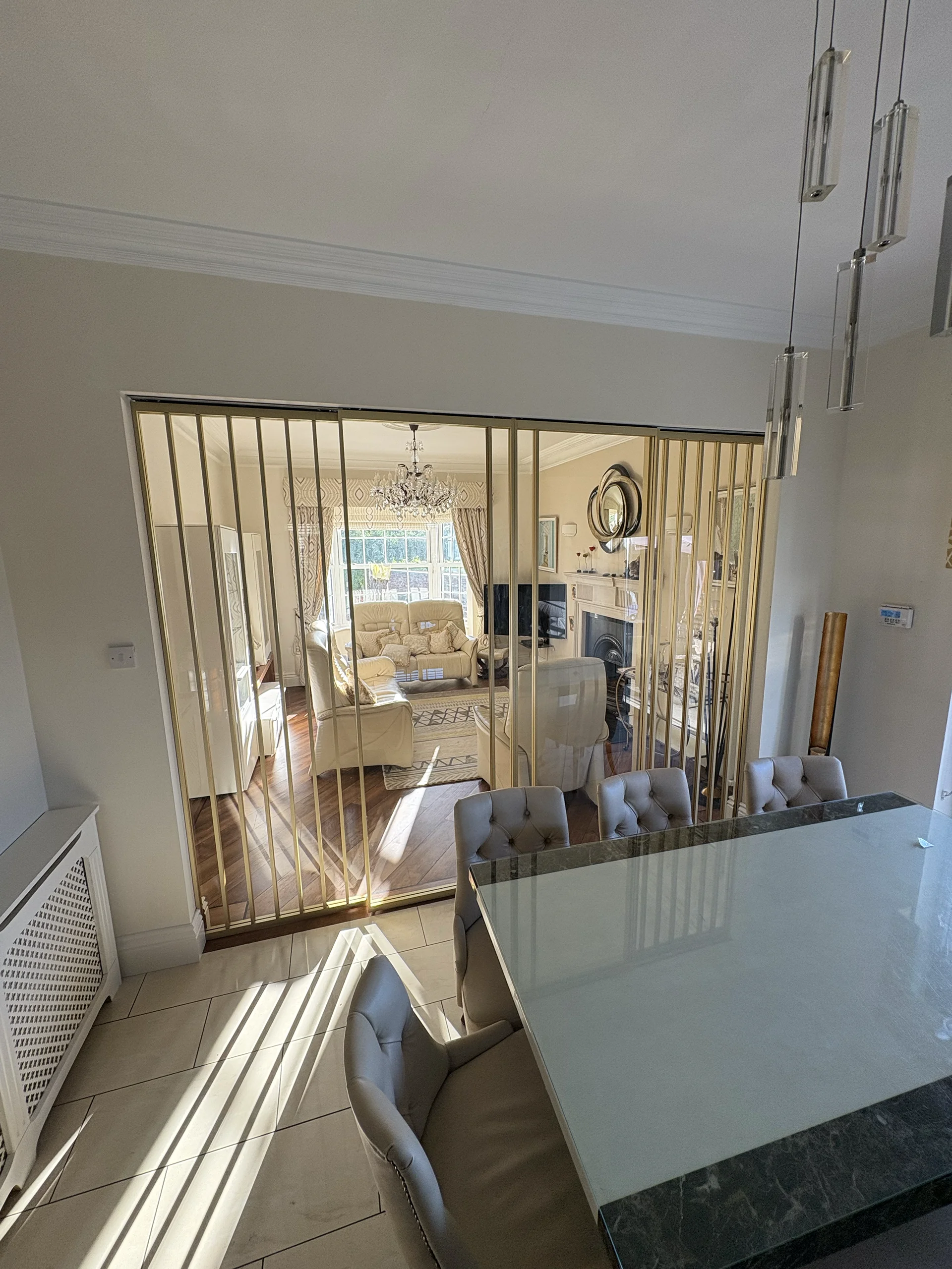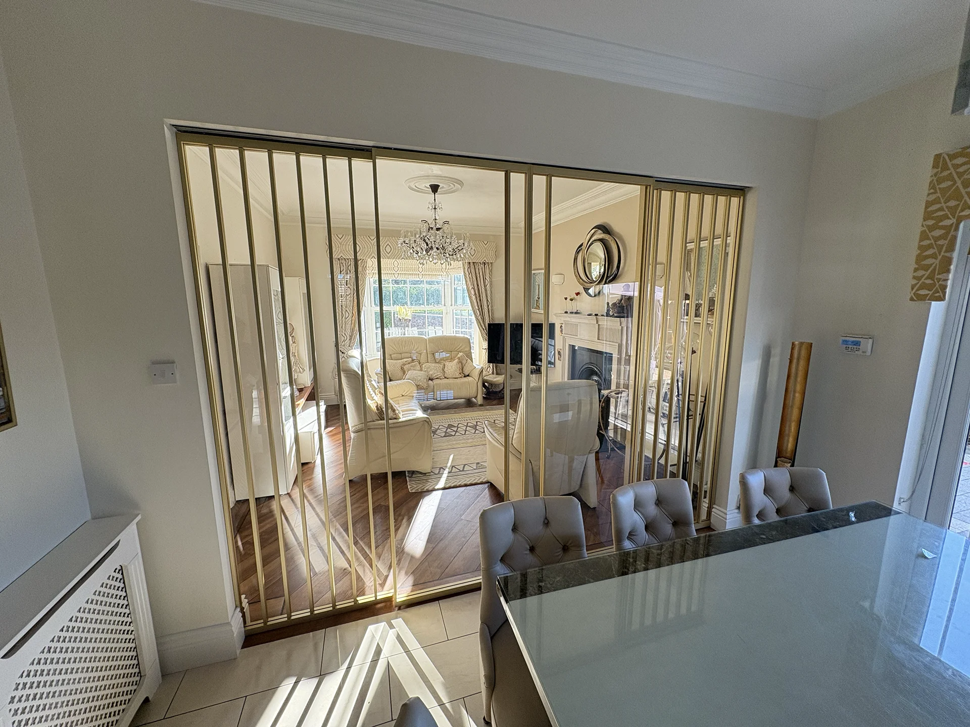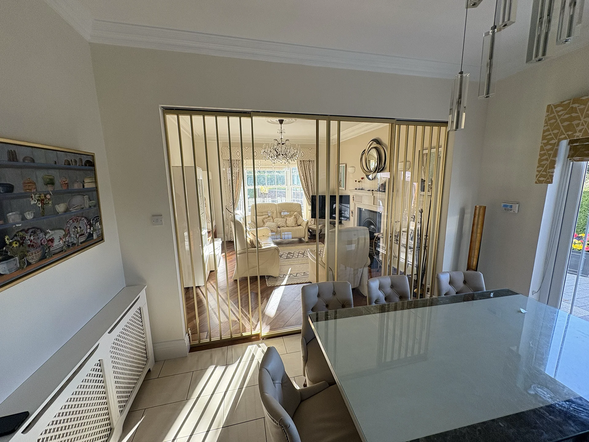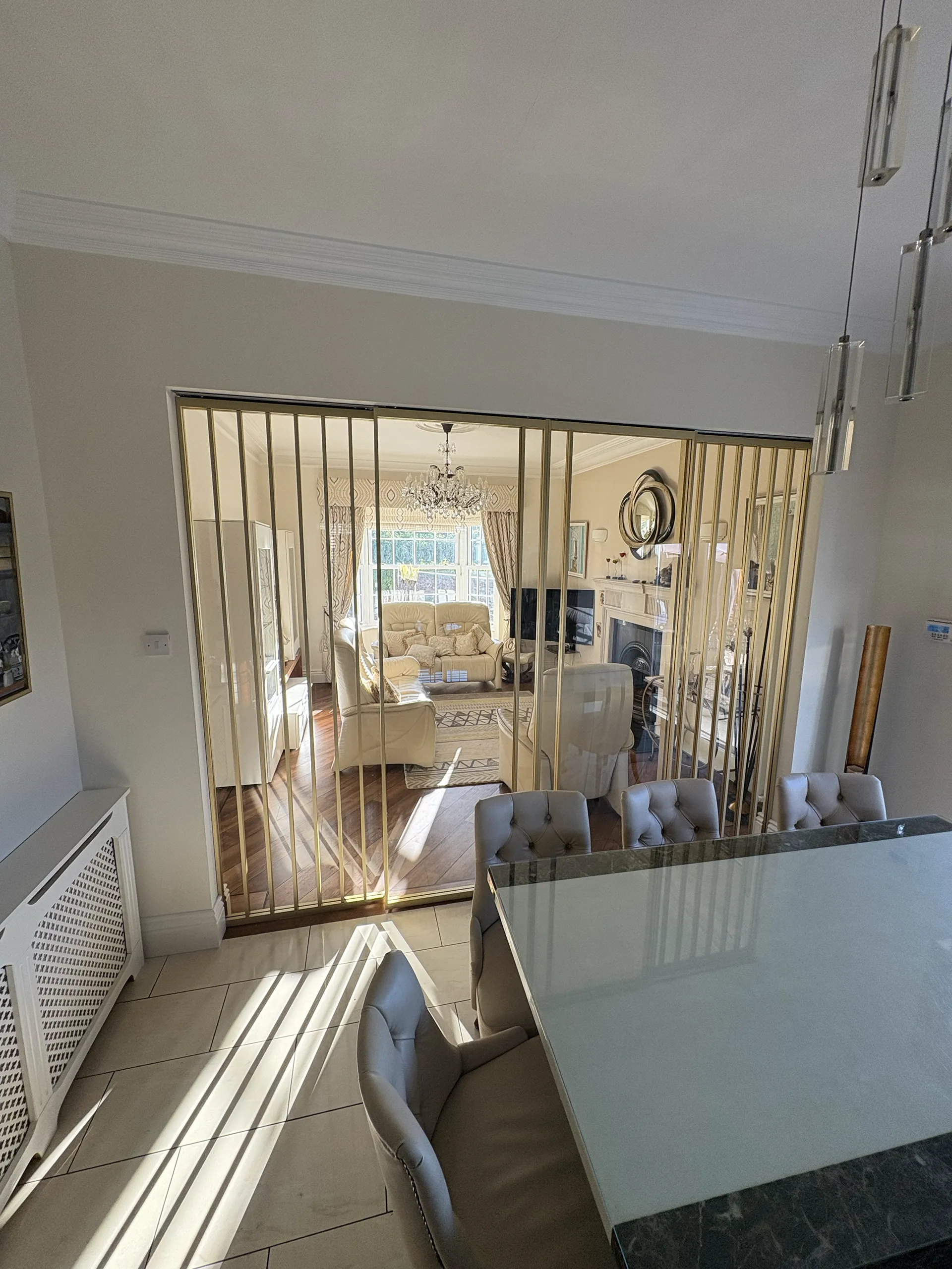 Ann and Aidan approached Frameless.ie seeking a practical yet elegant solution to partially connect their dining room and living room. The goal was to maintain an open-plan feel that allowed easy visibility of their grandchildren while still having the option to separate the spaces when needed—especially during TV time or when entertaining guests.